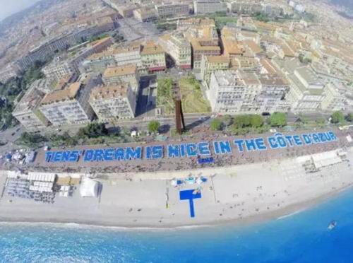 2017年5月8日,法国尼斯年会。蔚蓝海岸,来自全球的天狮事业伙伴,利用人体队形创意拼写出巨大的“TIENS’DREAM IS NICE IN THE COTE D’AZUR(天狮梦想,尼斯绽放)”,6262人的有效人数创造了最大规模人体主题创意组字的吉尼斯世界纪录。