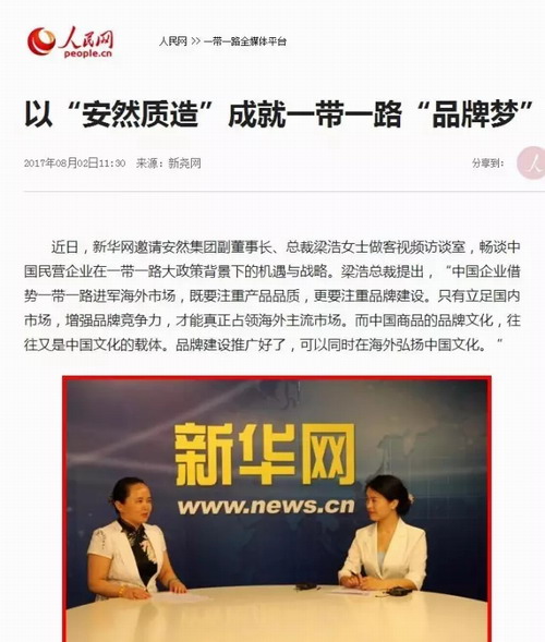 日前,安然公司副董事长、总裁梁浩女士受邀走进新华网,做客《新华访谈》节目。在访谈中,梁总就纳米技术和民用化、品牌建设及驱动力等热点话题与主持人互动交流,为广大网友答疑解惑。在重点论述如何讲好安然的品牌故事时,梁总表示安然将紧紧抓住产品质量,坚持科技创新,创立全新运营模式,让安然品牌熠熠生辉。