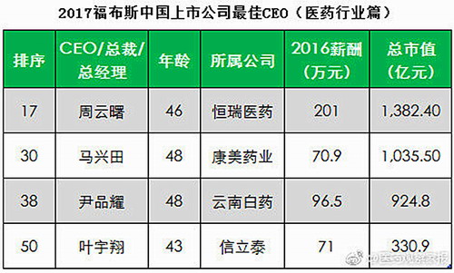 据统计,上榜的CEO们在2016年的平均薪酬为506.87万元,平均年龄为50岁。从医药行业来看,在福布斯2017年中国上市公司最佳CEO的50强榜单上,有4位药企高管上榜,分别是恒瑞医药的周云曙、康美药业的马兴田、云南白药的尹品耀、信立泰的叶宇翔。