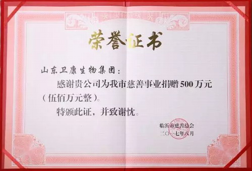 作为根植沂蒙、热爱沂蒙的本土企业,卫康生物集团董事长、总裁王宗继向临沂市慈善总会捐赠善款500万元,被授予“临沂慈善总会执行会长”和“临沂市杰出慈善家”称号。王宗继董事长的大爱与义举为贫困家庭燃起了希望之光,为弱势群体撑起了一片蓝天,赢得了与会领导和现场观众热烈的掌声。