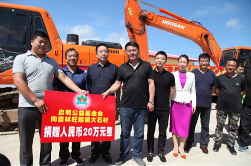 8月19日上午,启明公益基金会、北京罗麦科技有限公司携手吉林市工商局共同走进吉林丰满区旺起镇大石村,捐款人民币20万元整,租用10余辆挖沟机用于灾区重建。