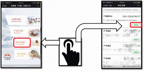步骤2:点击“附近店铺”按钮,即可一键导航至距离最近的服务中心、专卖店,购货更方便。