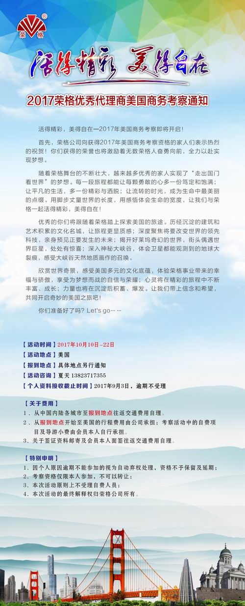 荣格发布2017优秀代理商美国商务考察通知