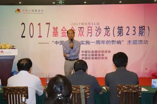 基金会双月沙龙上,慈善法专家北京师范大学社会发展与公共政策学院陶传进教授关于"中国慈善法实施一周年观察报告"这一主题,进行了演讲,他指出:公益慈善事业发展并不是靠一个《慈善法》激活活力的,《慈善法》并没有一个打开窍门、通道、拔掉活塞的作用,《慈善法》是对前面二十多年、三十多年改革公益领域的固化和为未来慢慢打通道,是继往开来的作用。