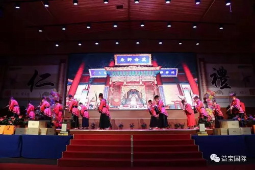 益宝乐舞团为参会的益宝家人们表演了正宗的八佾舞。八佾舞是古代祭祀最高规格的舞蹈,益宝乐舞团是在董事长孔庆保先生的带领下,由益宝员工组成,每天准时在曲阜孔子像前展示。其动作庄严齐一,节奏平稳。现场气氛肃穆,家人们看的聚精会神,仿佛穿越到千年前的祭祀现场。舞蹈结束,在场家人全体起立向圣人孔子行三鞠躬礼。