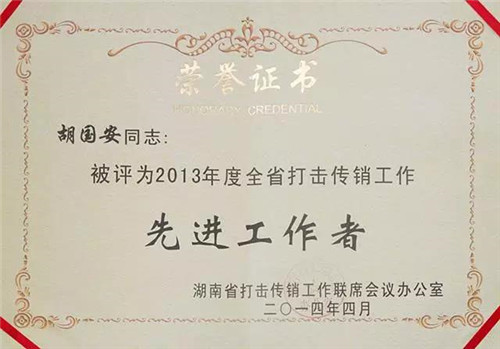 胡国安董事长获评“2013年度湖南省打击传销先进工作者”