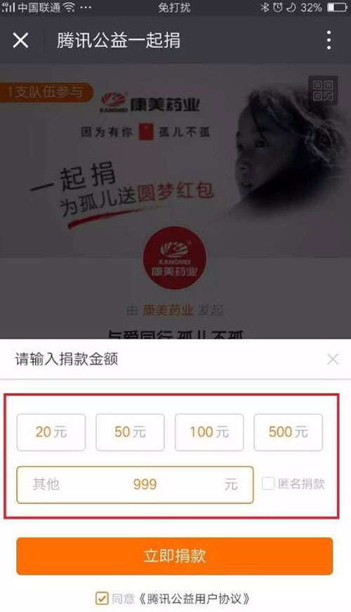 2、选择/输入捐赠金额后,点击“立即捐款”;