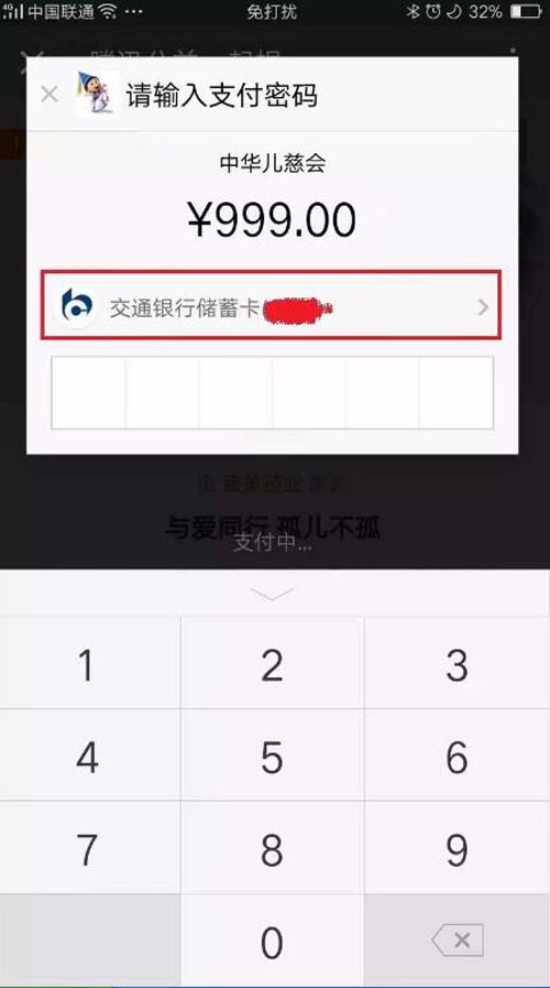 3、确认捐赠金额及支付方式后,输入密码,完成捐赠。