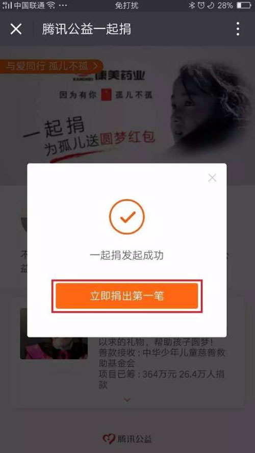 4、点击弹出的“立即捐出第一笔”,重复付款步骤,即可完成捐赠;