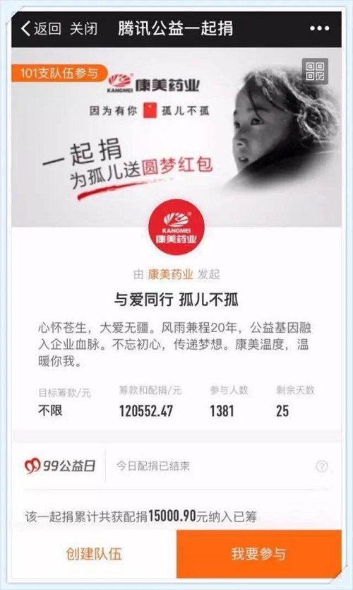 9月9日,一年一度的腾讯“99公益日”落下帷幕,数亿人见证并参与了这次全民公益盛典。康美药业携手中华少年儿童慈善救助基金会(以下简称中华儿慈会)发起的“孤儿圆梦红包”企业一起捐活动受到社会广泛关注,上线首日即为孤儿募集善款超过10万元,整个“99公益日”期间更是吸引了1300多人参与捐赠,累计募款超过12万元。