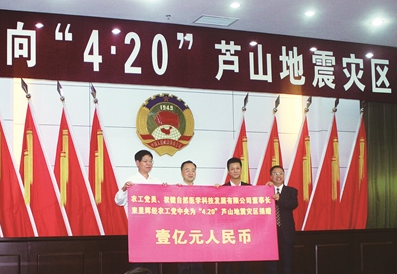 束昱辉董事长向四川芦山地震灾区捐款一亿元