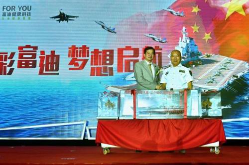 紧接着,吴方臣将军上台致辞,从国内外形势到富迪事业平台,娓娓道来,引人入胜。他说:“富迪这一艘航空母舰,再一次盛大启航,我相信,富迪公司一定会精准掌控它的方向,沿着成功的方向,驶向光耀的未来。”并将寓意富迪事业的航空母舰模型及寓意富迪事业腾飞的舰载战斗机模型赠予富迪公司,陈怀德先生上台从吴方臣将军手中接过了盛满千万富迪家人对美好生活的向往模型,并接受了将军的美好祝福。