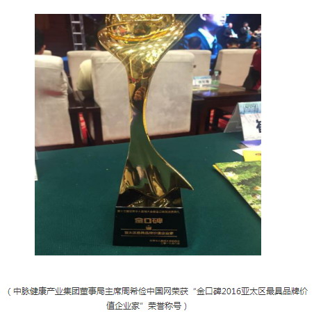典礼上,尤为突出的是,中脉科技凭借自身品质荣获“金口碑 2016 亚太区最具合作价值企业”、“亚太区年度最佳公益项目”双项大奖,中脉健康产业集团董事局主席周希俭荣获“金口碑 2016 亚太区最具品牌价值企业家”荣誉称号!