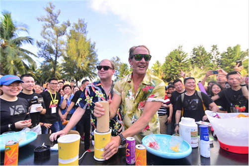 大卫(右)与凯尔(左)一起给海南的年轻伙伴调制XS特饮