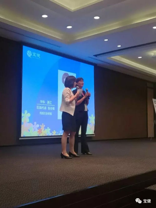 区县代表浙江张春菊登台分享,她曾是传统行业老板,由于爱美在美容院毁了脸部皮肤,各种方法没有修复,体验宝健产品一个月就有了改善,儿子也吃产品调理好了鼻炎,于是她以老板的思维来做宝健,在这个直销快速发展的时代要做就得快,4个月就授权区县代理商。