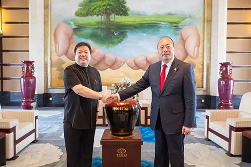 贵州茅台酒厂(集团)白金酒有限责任公司董事执行总裁陈宁、营销总监吴鹏等一行,于9月21日上午抵达天狮集团进行文化交流拜会,天狮集团董事长李金元亲自接待了远道而来的贵客。李金元董事长与陈总一行就近期天狮与贵州茅台酒厂(集团)白金酒有限责任公司洽谈合作意向及其进展进行了深入探讨,并对天狮与代表中国文化的国酒-贵州茅台酒厂(集团)白金酒有限责任公司的合作给予肯定并表示深具信心。李董事长同时阐述了天狮开启第三次创业的精神意义和目的,并表示天狮正在加紧串联全球大健康生态圈,抓住上下游带动的终端模式,以一体多翼、相互置换、整合全球资源来实现天狮全球化布局的规模与雄心!