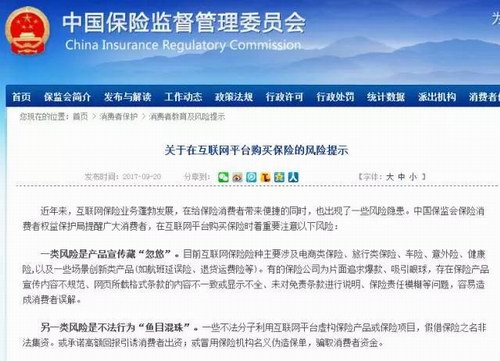 9月20日,保监会官网发布“关于在互联网平台购买保险的风险提示”称,一些不法分子利用互联网平台虚构保险产品或保险项目,假借保险之名非法集资。或承诺高额回报引诱消费者出资;或冒用保险机构名义伪造保单,骗取消费者资金。