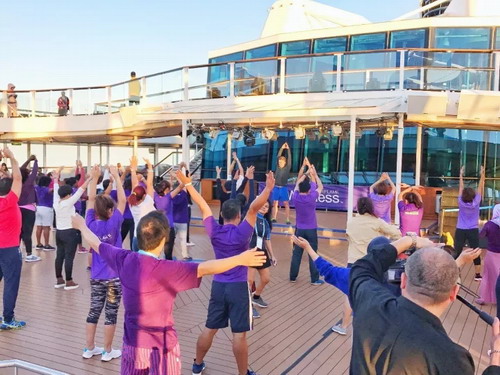 清晨七点,身着紫色外套的伙伴们已集聚一堂,伴随着悠扬的音乐,以瑞典特色健体操GYMPA唤醒一天的动力,感受瑞典健康的生活方式,心怀虔诚安气宁神,感受自然与海洋赋予的馈赠,这是一场源于心灵的修行。