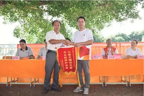 百峰小学校长代表学校向中脉公益基金会赠送锦旗表示感谢