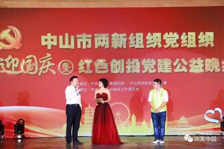 9月27日晚,中山市两新组织党组织迎国庆暨红色创投党建公益活动在石岐文化公园举行,成功为14个“党建公益”项目募集善款逾 58 万元。完美公司党委受邀出席活动,并爱心认捐“爱满屋”党助老精明行动项目。中山市委常委、组织部长陈小娟出席活动,并为完美党委等爱心党组织颁发纪念牌。