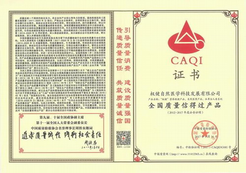 2017年9月,在中国质量检验协会开展的以“大力提升质量,建设质量强国”为主题的2017年全国“质量月”活动中,经过严格审查、筛选,权健自然医学科技发展有限公司凭借诚信的经营理念和优质的产品质量,从众多优秀企业中脱颖而出,荣获“全国质量诚信标杆典型企业”及“全国质量信得过产品”两项殊荣。