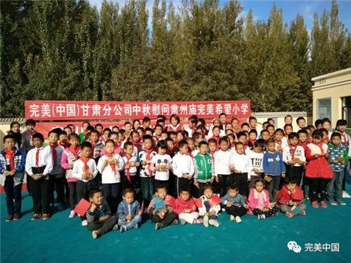 9月28日,共青团敦煌市委携手分公司前往敦煌市肃州镇完美希望小学开展中秋送暖爱心活动。完美公司为师生带去了32盒月饼。2013年,完美公司曾资助50万元筹建这所希望小学,圆了90余名孩子的上学梦。