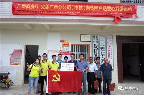 9月22日,完美广西分公司党支部携手自治区商务厅,前往崇左市大新县昌明乡东风村开展爱心月饼赠送活动,为该村139户贫困户送去爱心月饼和节日祝福,传递党和社会的关怀,将温暖和爱心洒向八桂大地。