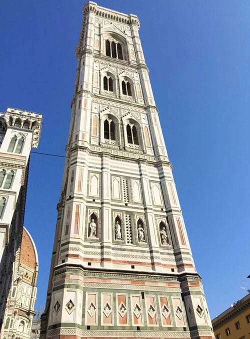 大教堂旁有一座巍峨的大钟塔,名为乔托钟塔。钟塔由各色大理石砌成,以几何学的配色方式调合而成,整个钟塔高约82公尺,底部还有精致的浮雕,颇为壮观。登上钟楼,可饱览佛罗伦萨市区风光。有的伙伴还乘坐当地特色马车游览,仿佛穿越历史,体验到古时期的贵族生活。