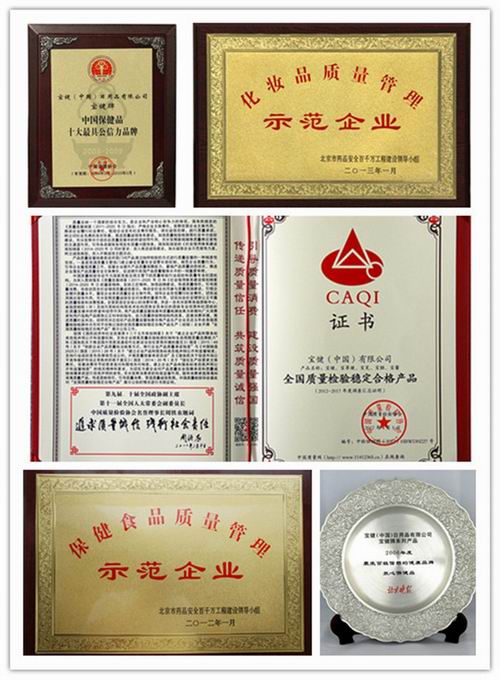 21年来,宝健不忘初心的质量坚守,精益求精的“匠心精神”,坚持以高于国家标准的要求,严格保证产品质量,获得殊荣无数,其中包括北京市药监局和北京保健品协会认定的“保健品质量管理示范企业”、“化妆品质量管理示范企业”、“十大公信力品牌”、“最受百姓信赖的健康品牌”、已经累计16次获得“全国质量检验稳定合格产品”荣誉。
