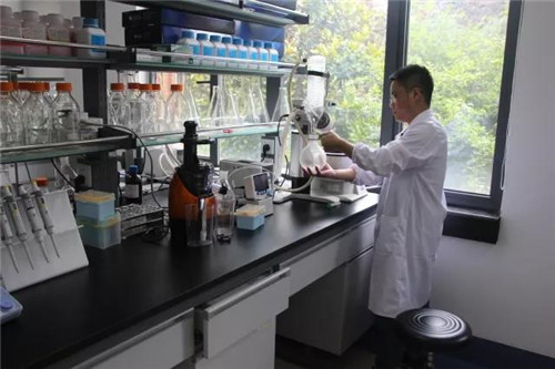 同济大学安发天然药物研究院研究员展示发酵提取实验过程
