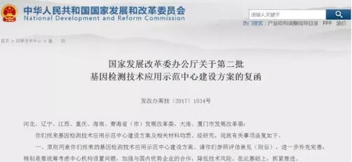 2015年6月,国家发展改革委发布了《国家发展改革委关于实施新兴产业重大工程包的通知》(发改高技[2015]1303号),将基因检测技术应用示范中心纳入六大重点工程领域之一——“新型健康技术惠民工程”,支持拥有核心技术、创新能力和相关资质的机构,采取网络化布局,建设示范中心,以开展遗传病和出生缺陷基因筛查为重点,推动基因检测等先进健康技术普及惠民,引领重大创新成果的产业化。