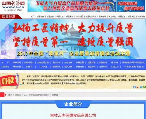 2017年全国“质量月”企业质量诚信倡议活动共吸引全国各行业、区域具有代表性的1000多家优秀典型企业的积极参与,其中吉林云尚也荣幸在列,并受到《中国质量报》、《中国消费者报》、中国质量网、中国经济网、中国消费网、中国质量新闻网等多家媒体的关注。