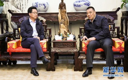 甘肃省定西市委副书记、市长戴超与康美药业董事长、总经理马兴田座谈。新华网发