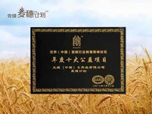 2017年10月11日—13日,主题为“眼观数据,精营发展”的首届世界(中国)直销舆情高峰论坛暨颁奖典礼在广州隆重举行。会上颁发了直销行业的多项重要奖项,其中克缇发起的艺术公益活动“麦穗计划”被评为“年度十大公益项目奖”,此项荣誉是对麦穗计划的肯定,也是对克缇投身艺术公益、践行企业社会责任的褒奖。