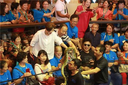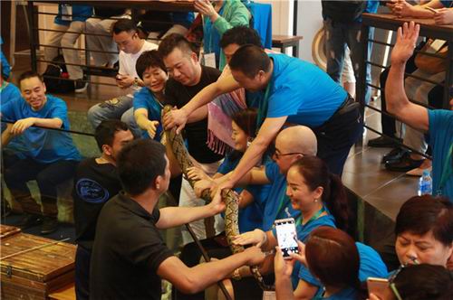 本次隆力奇普吉岛奇幻之旅,毒蛇研究中心自然是重点旅游项目之一,研究中心展示厅内有眼镜蛇、蝮蛇、赤练蛇、金环蛇、银环蛇等数十种毒蛇,或盘形环状在地上休息,或攀在树上,居高临下,悠然自得。同时研究中心的工作人员还给我们表演了精彩的“人蛇秀”,空手捉蛇、亲吻眼镜蛇等惊险环节让我们惊叫连连,同时我们还与这些毒蛇亲密接触,抚摸蛇身,或盘在自己身上合影。蛇作为隆力奇的重要文化,在普吉岛能够以这样的方式与蛇亲密接触,这是我们隆力奇人的不同文化体验。