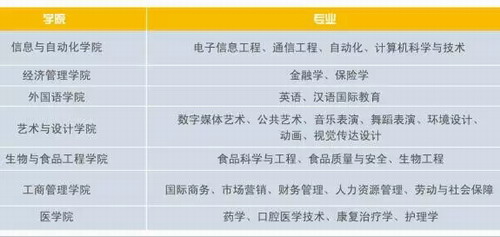 学院现设有经济管理学院、信息与自动化学院、工商管理学院,外国语学院,艺术设计学院、生物与食品工程学院、医学院等7个二级学院。开设有电子信息工程、市场营销等27个本科专业。学校具有学士学位授予资格。
