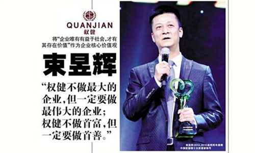 “我们权健坚持推行道德文化,道德文化的最高境界就是慈善文化,慈善文化也就是大爱文化。但光有文化还不够,文化的意思并不是冠冕堂皇的口号,它应该是配合企业一起行动,产生出有明显效果的慈善行为。”束昱辉把道德文化定为权健的企业文化,并着重强调它的现实意义。