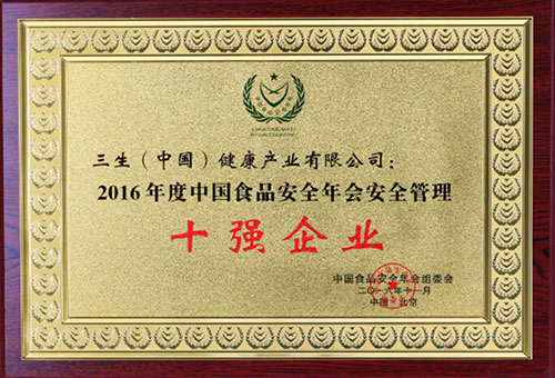 2016年11月18日,在北京人民大会堂举行的第十四届中国食品安全年会上,三生与伊利、加多宝等知名企业一同荣获中国食品安全年会“百家诚信示范单位”称号,黄金宝董事长荣获中国食品安全年会安全管理“十大人物”,同时连续第六年获得大会颁发的“中国食品安全十强企业”称号,成为捍卫中国食品安全的中坚力量。
