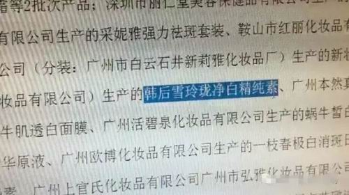 广州十长生化妆品有限公司生产的韩后雪玲珑至臻无暇净白精纯素,检出倍他米松成分。
