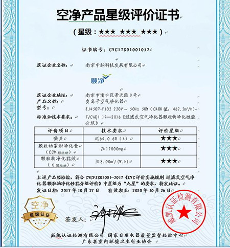 此外,中脉颐净负离子空气净化器成功通过国家质检总局指定检测机构的“星级认证检测”,评定为“九星级(满星)产品”。该认证经由威凯认证检测有限公司(CVC)按照《过滤式空气净化器颗粒物净化性能分级》标准,从颗粒物累积净化量、颗粒物净化能效、噪声三个项目分别进行一至三星的评定,最终以三个项目的星级之和作为空气净化器净化性能的最终星级标准。中脉颐净负离子空气净化器能够获得九星认证的满分佳绩,代表该产品在全部的三个测试项目中,都经受住了专业检测机构的严格考验,取得的评测效果极为优秀。