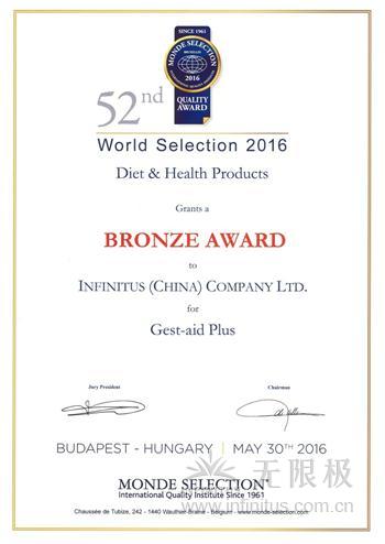 2016年,无限极常欣卫口服液获得全球质量行业的权威奖项——“国际品质评鉴组织(Monde Selection)”(简称蒙特奖)颁发的铜奖;同时,获得2015年“广东省高新技术产品”认定。