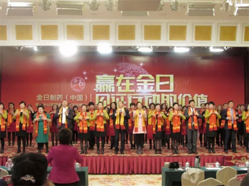 金日制药(中国)新疆分公司总经理何爱艳、金日制药(中国)教育部健康专家殷椿和教授、金日制药(中国)一星董事黄小芹、全球总监剧春延、丁晓林、全国总监钟江易、李拥军、居莱提暨区域总监、高级经理以及全疆各地的800余金日家人欢聚一堂!