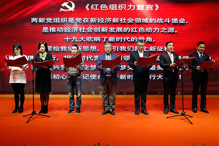 7位来自浙江省各地的“两新”组织党组织负责人共同宣读《红色组织力宣言》