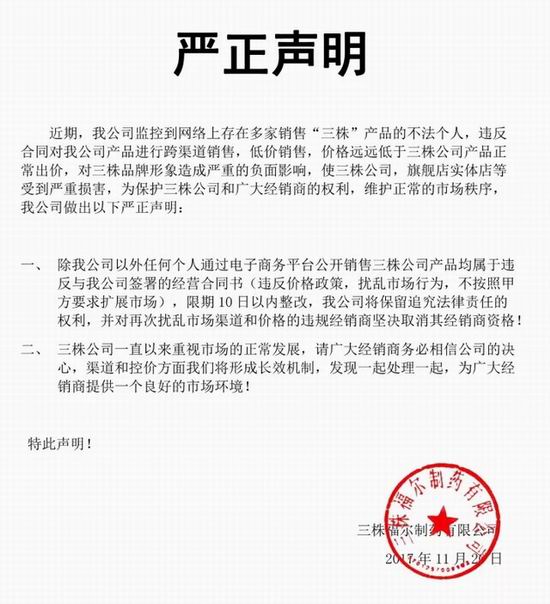 三株声明:严打扰乱市场秩序和价格的经销商