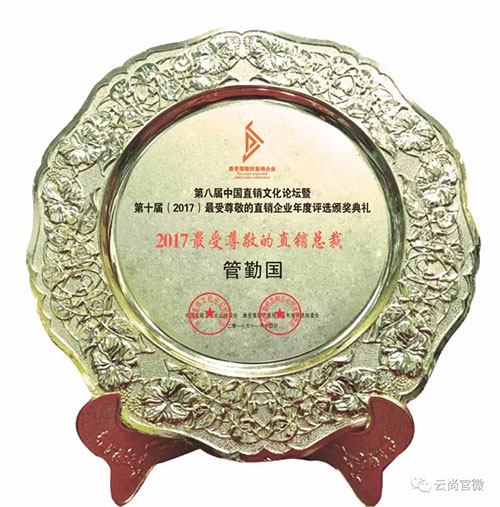 作为直销行业一年一度的颁奖盛典,组委会在根据企业所创造出来的市场业绩、综合盈利能力及带动人员就业、创业等综合实力的基础上,按照销售业绩、人文形象、产品质量、社会责任、成长速度、发展潜力、管理水平、战略创新等八个方面的指标,吉林云尚荣耀载誉,折桂“最佳创业平台”至高荣誉奖章!吉林云尚董事总裁管勤国先生荣膺2017年度“最受尊敬的直销总裁”!