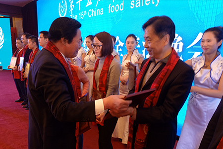 中国食品安全报社社长兼总编辑朱长学为三生(中国)代表贾福怀颁奖