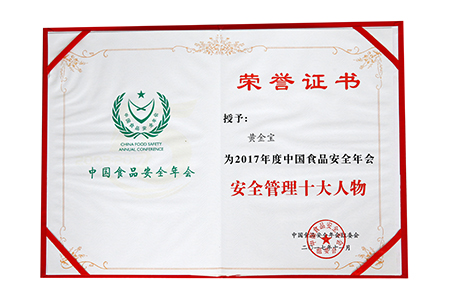 黄金宝董事长被授予2017年度中国食品安全年会“安全管理十大人物”