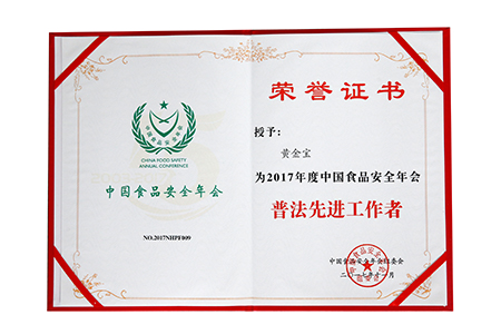 黄金宝董事长被授予2017年度中国食品安全年会“普法先进工作者”