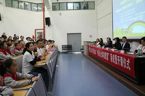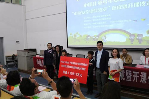 中国儿基会副主任黄焕铿和中脉科技美体事业代表吴丽妹向云南师大附属润城学校校长姜萍递交安全体验教室捐赠牌。