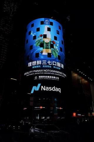 理想·鲜三七口服液、云南彝药排毒眼罩、云南昌宁号茶铺、生力胶囊登陆纳斯达克大屏。在展播过程中,印有“理想”、“云南昌宁号茶铺”、“龙发制药”、“云南彝药”LOGO的企业形象、文字信息清晰的出现在大屏幕上,引起行人侧目观看,独特新颖的海报设计和中式传统文化引起了纽约时代广场路人兴趣,纷纷驻足留影。